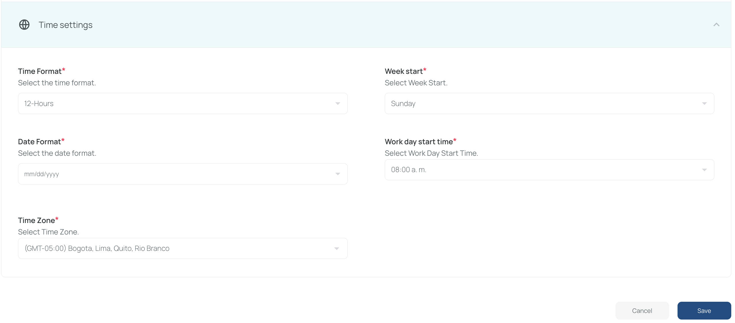 - In Branding & Time Settings, locate the Time Settings section and configure the fields as needed: