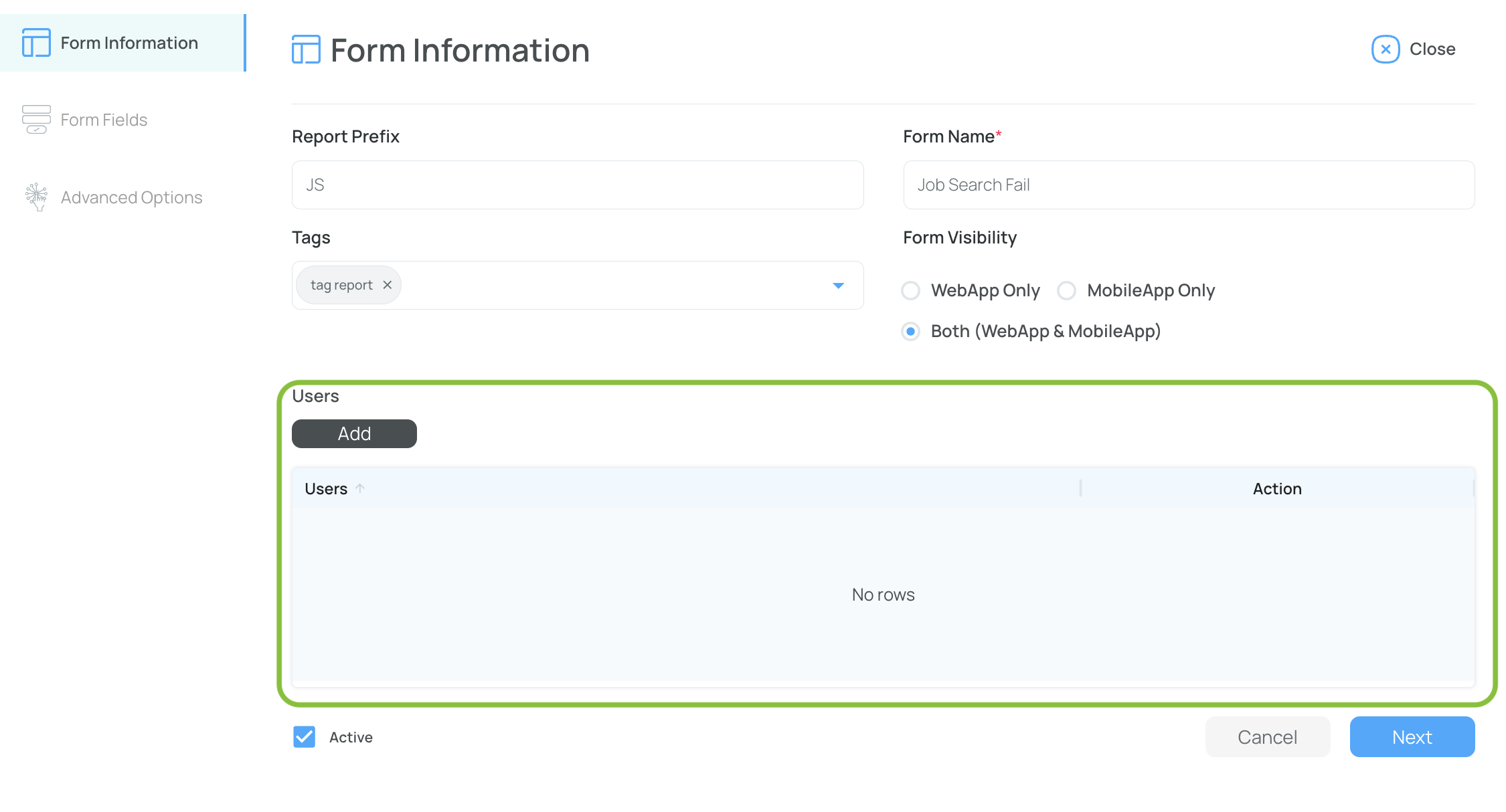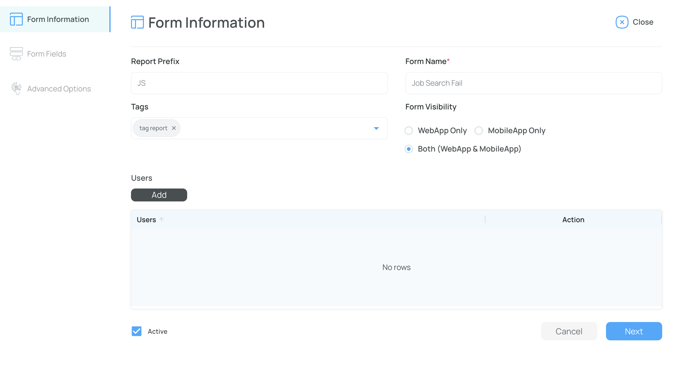 - Form Information: Update prefix, name, tags, visibility, or assigned users.