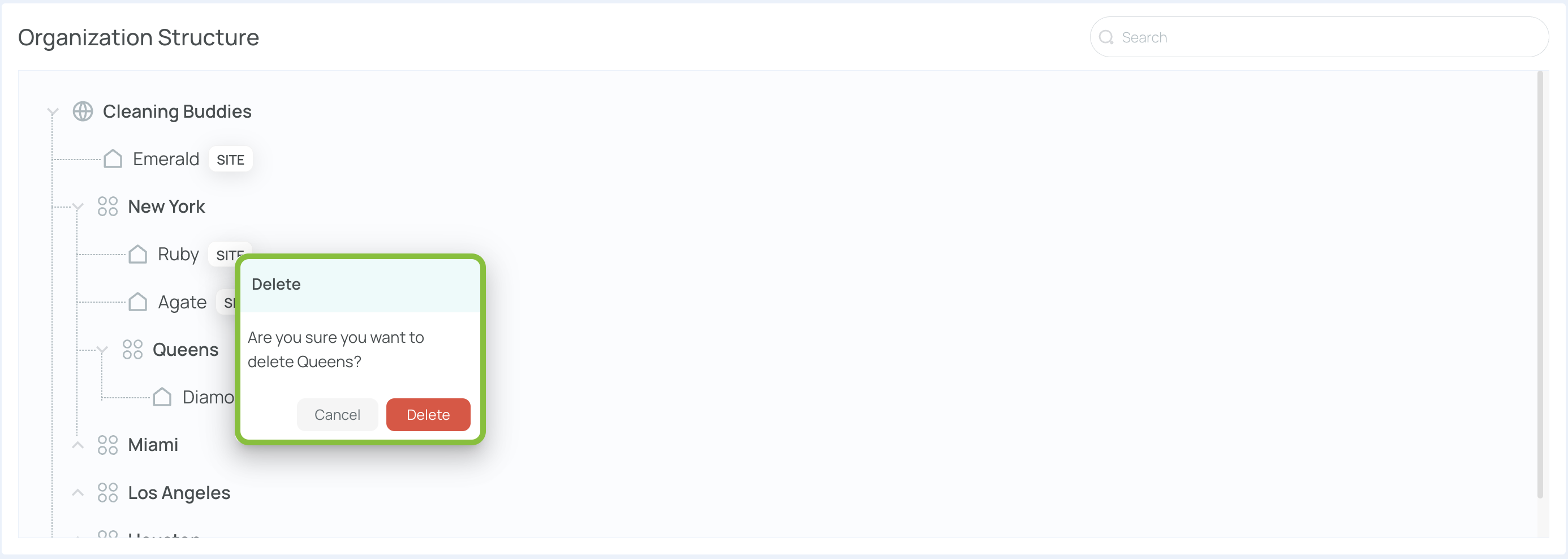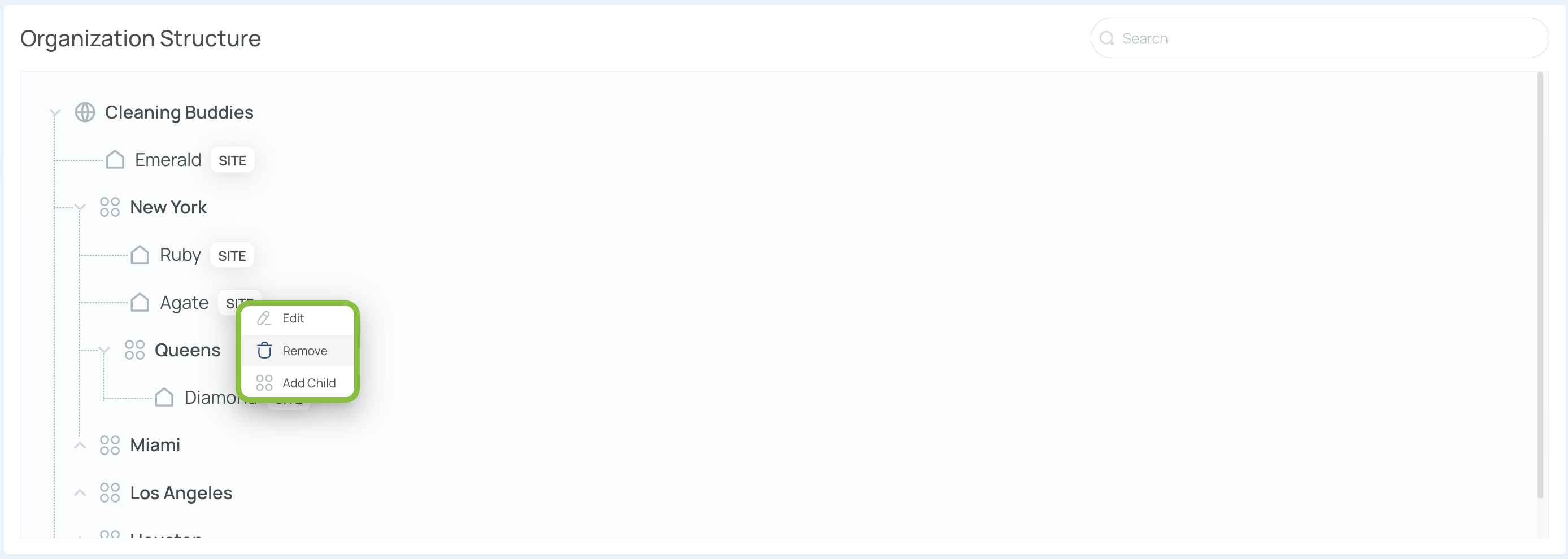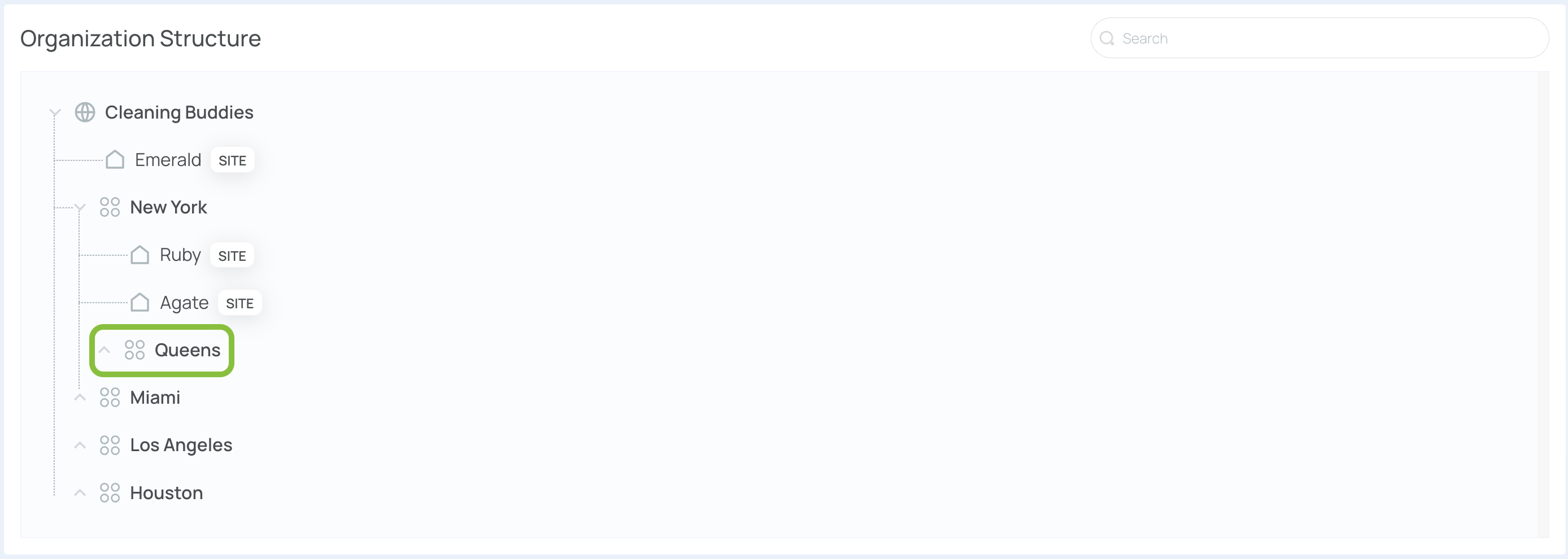 The company Cleaning Buddies operates six sites—Ruby, Diamond, Emerald, Quartz, Amethyst, and Sapphire. Two Level 1 entries, New York and Miami, group these sites. Queens serves as a Level 2 (neighborhood under New York). You can repeat this pattern up to five levels, ensuring each portion of your organization is properly represented.