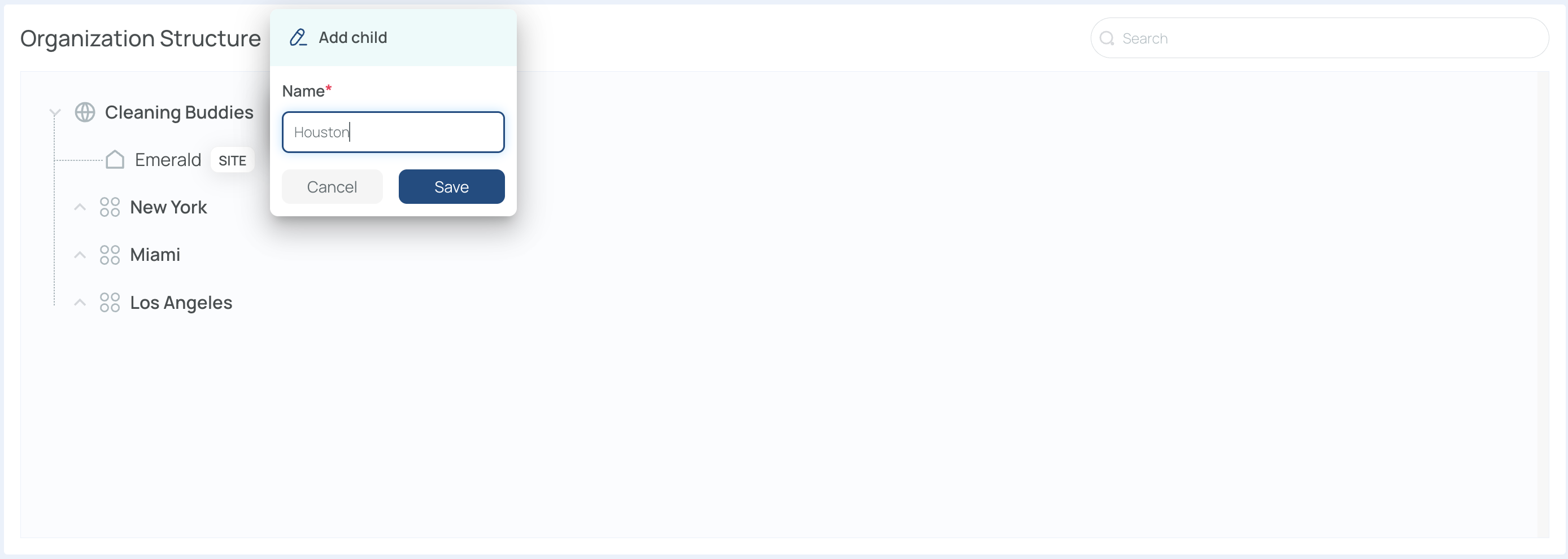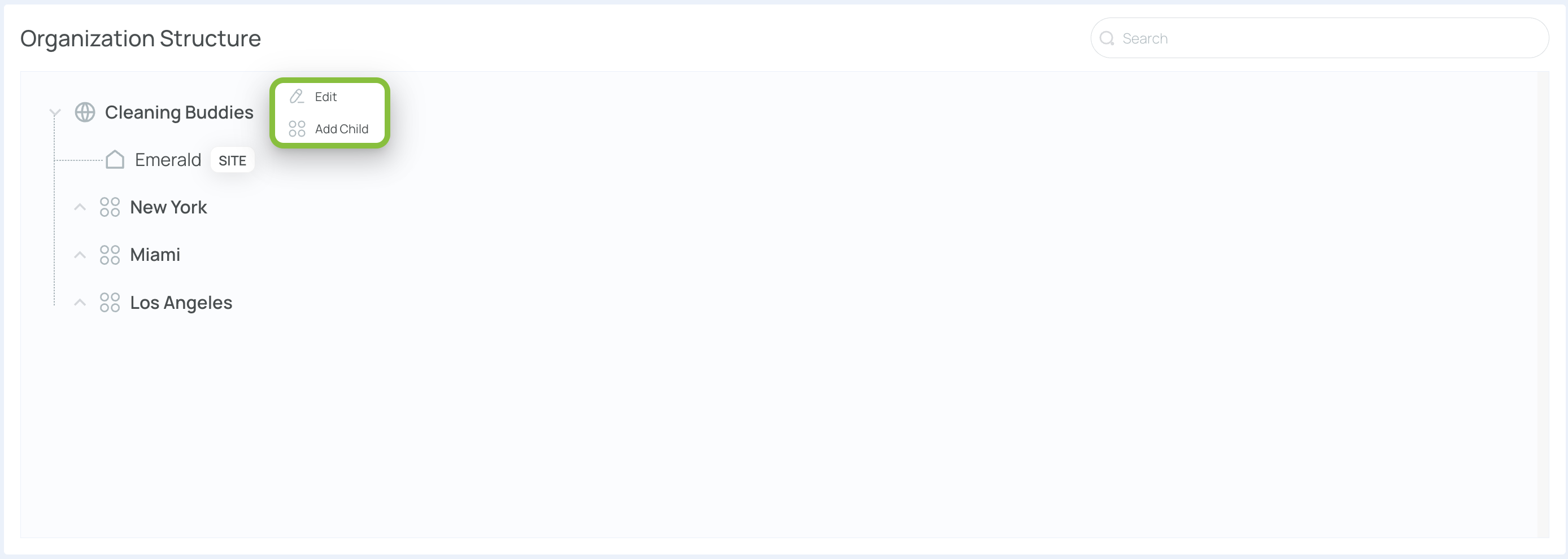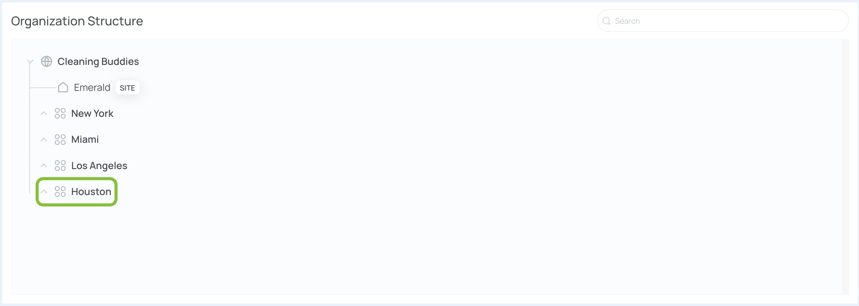 The company Cleaning Buddies operates six sites—Ruby, Diamond, Emerald, Quartz, Amethyst, and Sapphire. Two Level 1 entries, New York and Miami, group these sites. Queens serves as a Level 2 (neighborhood under New York). You can repeat this pattern up to five levels, ensuring each portion of your organization is properly represented.