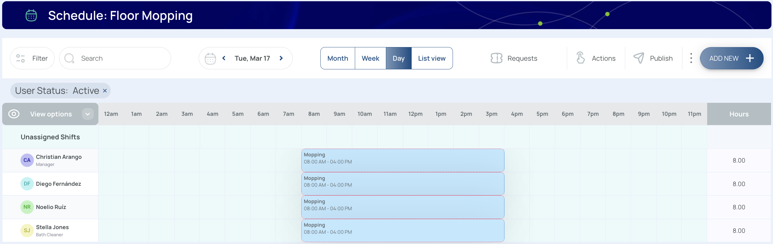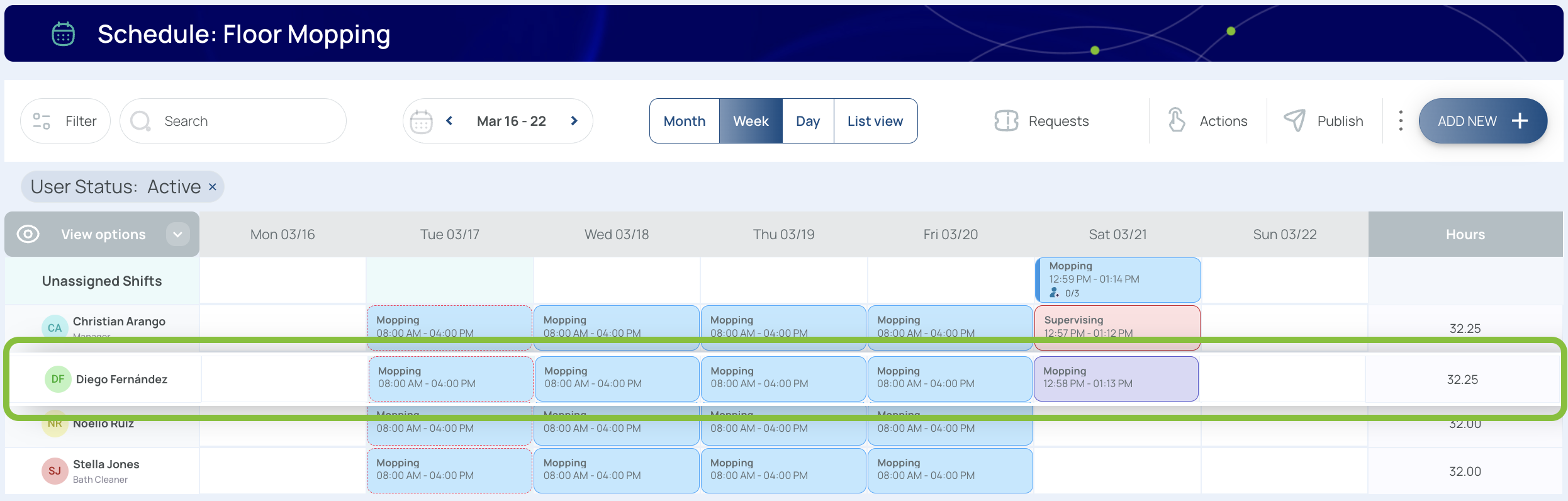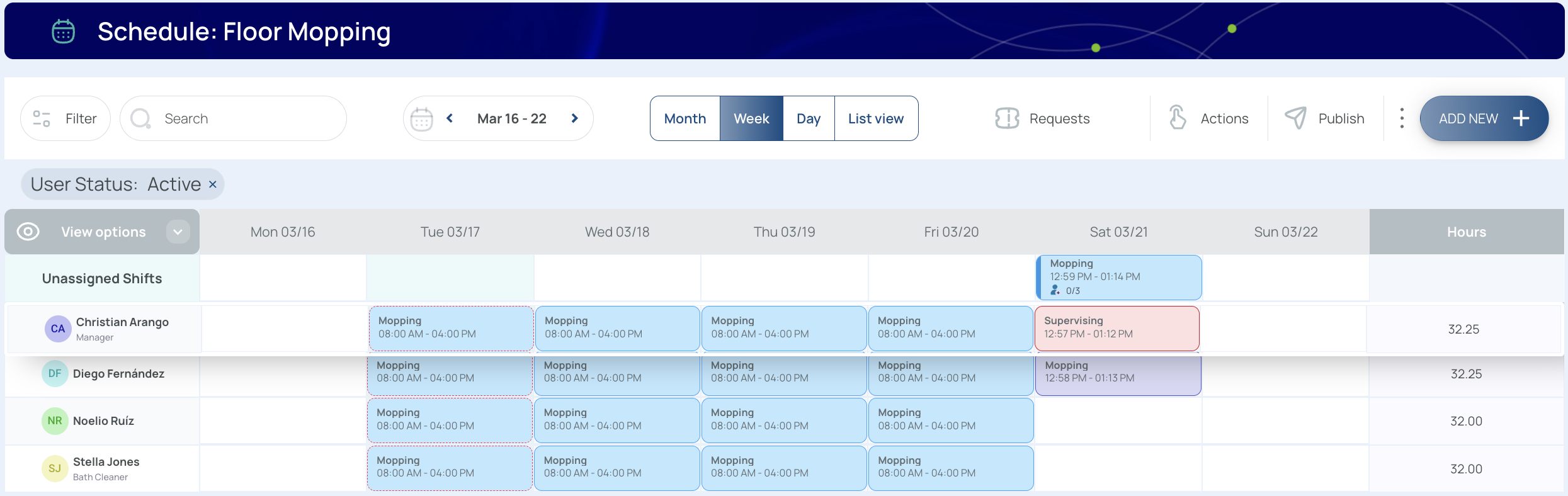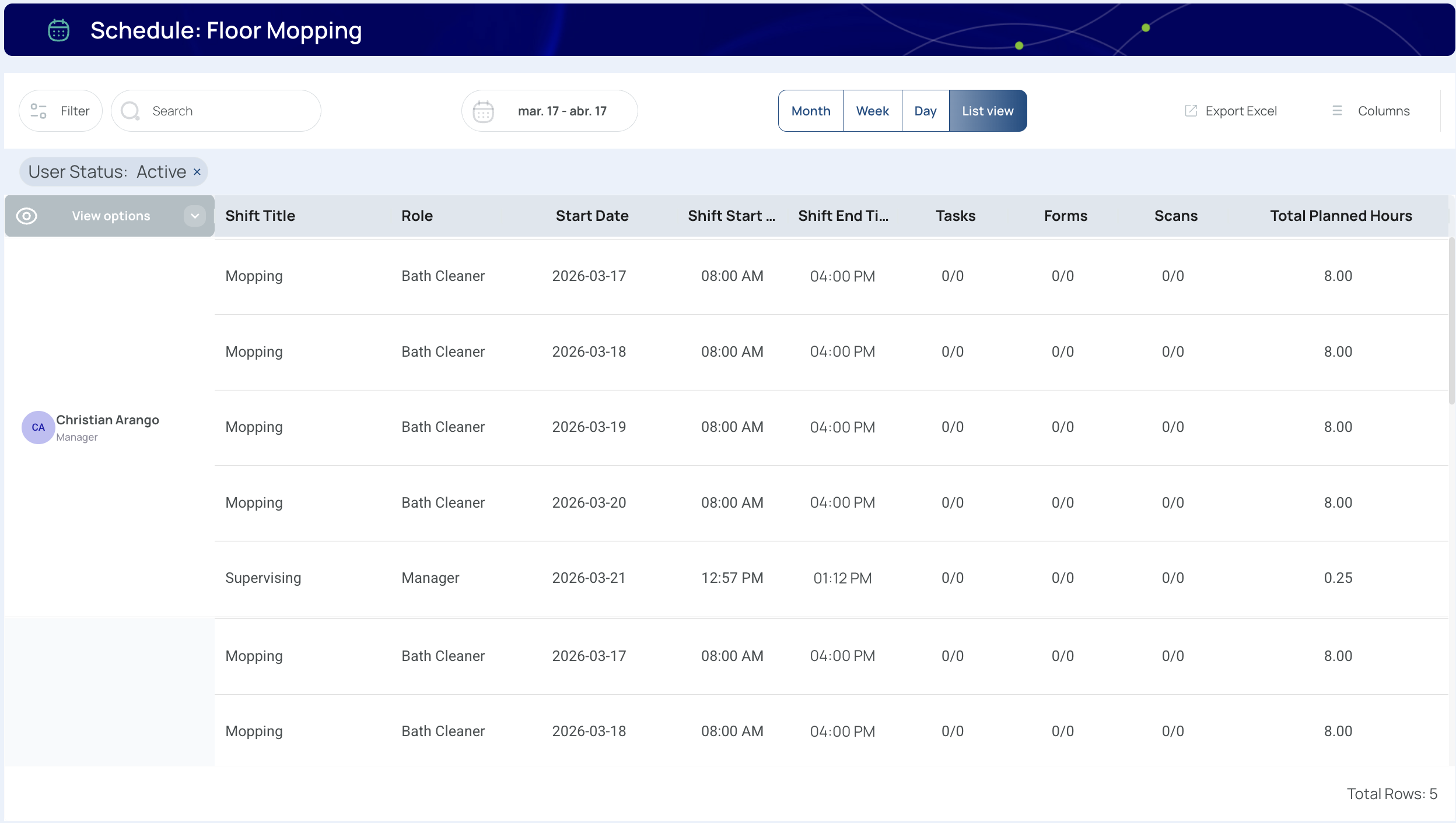 - Shift View: Shows user columns, assigned shifts, and hours details.