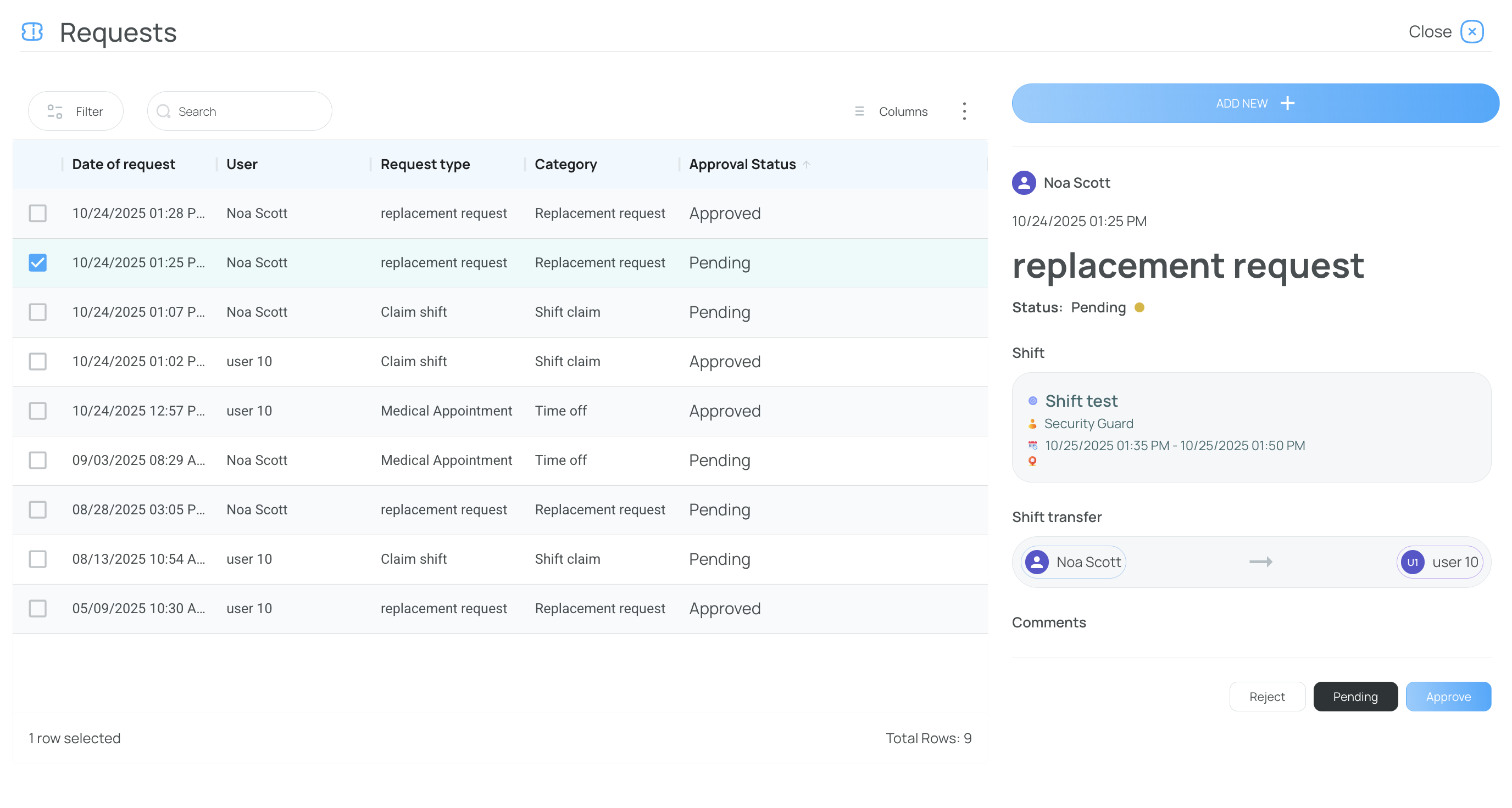 Access user requests (e.g., Time Off, Claim Shift, Replacement Requests) within the scheduling interface. Admins can accept, reject, or set them as pending.