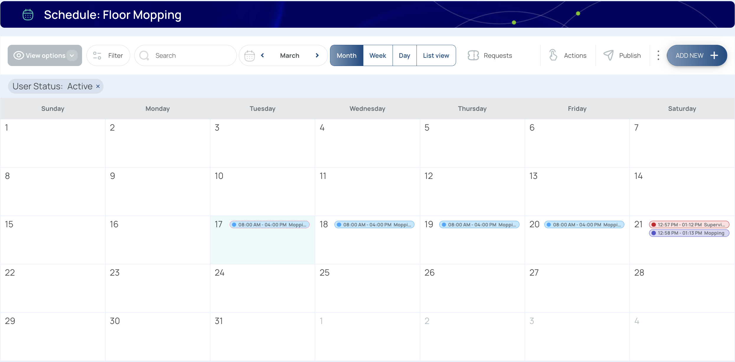 - Tool Bar: Contains filters, search bar, date selector, time selector, request button, actions button, publish button, the 3-dots menu, and the Add New button.