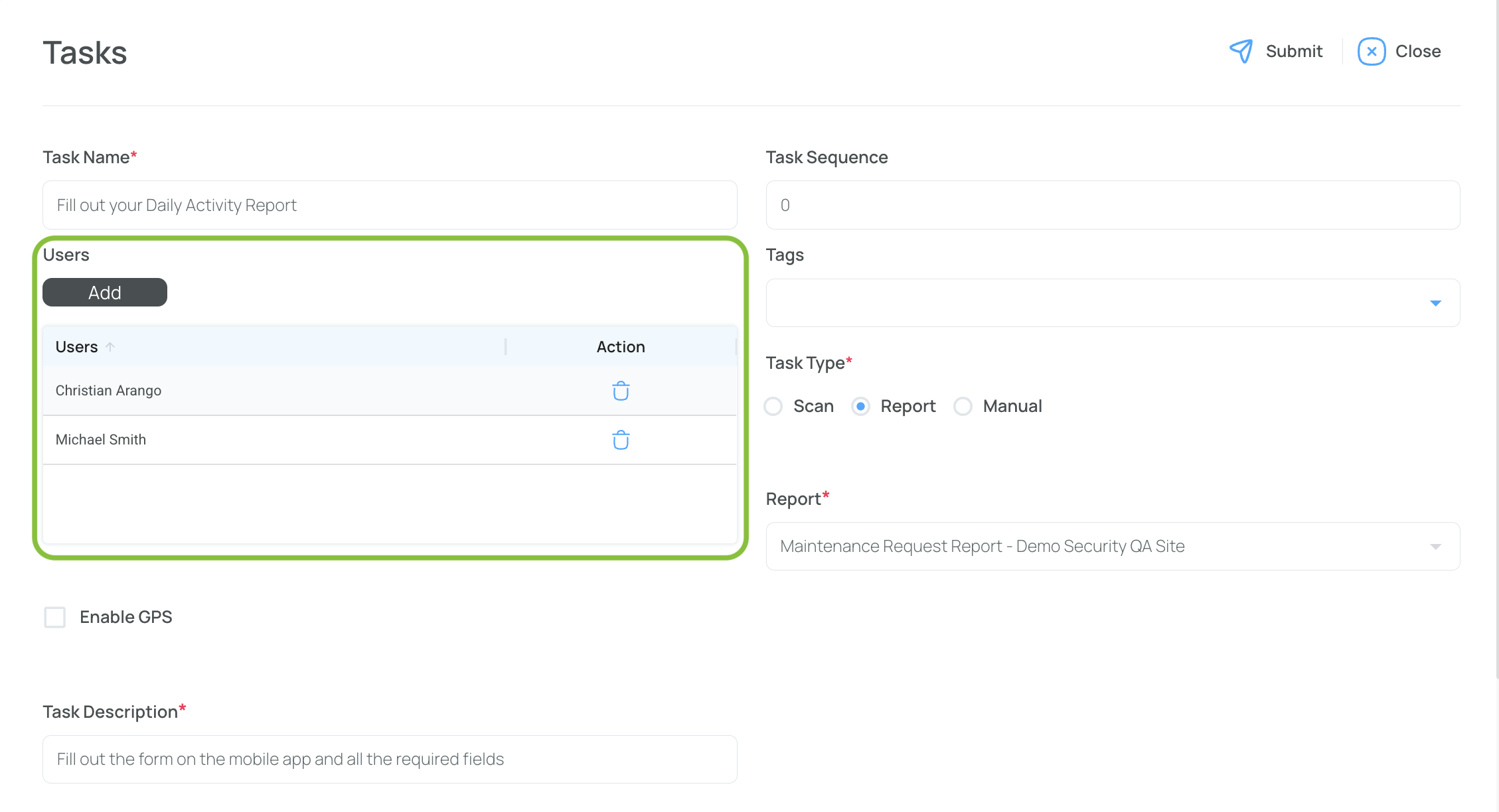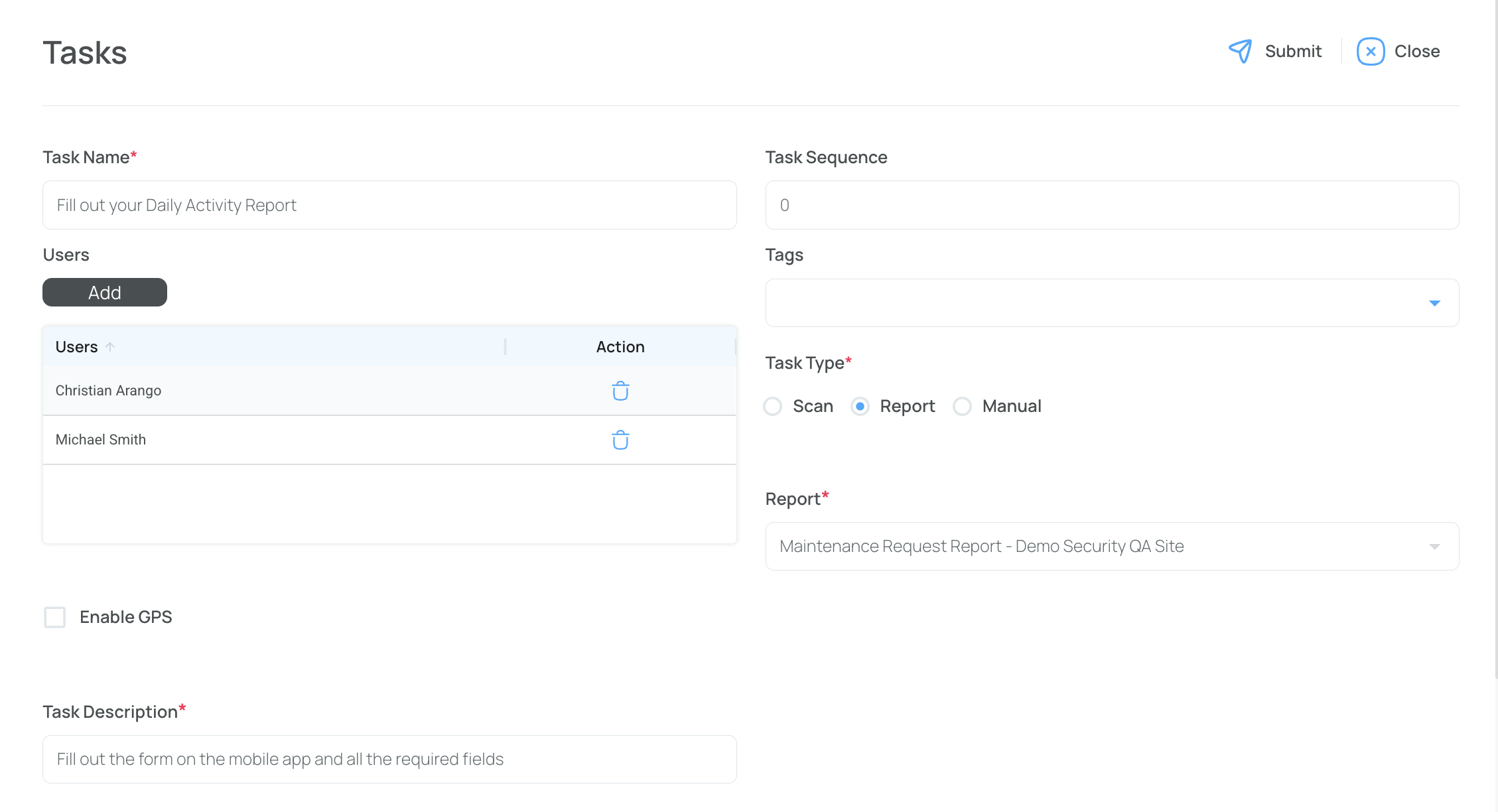 Tasks are goals or actions that employees carry out as part of their job duties. Each task can be associated with one or more people, a location, or even a category—like scan, which requires scanning a QR code or NFC tag; report, which requires filling out a form; or manual, which is checked off by the user. Tasks can also be configured as Geo-tasks if you need to capture or require location coordinates.