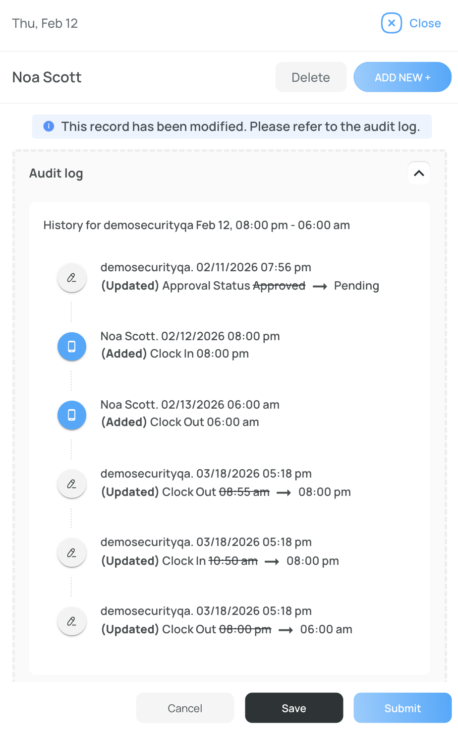 The Audit Log shows both the user’s entries and any modifications made by an administrator.