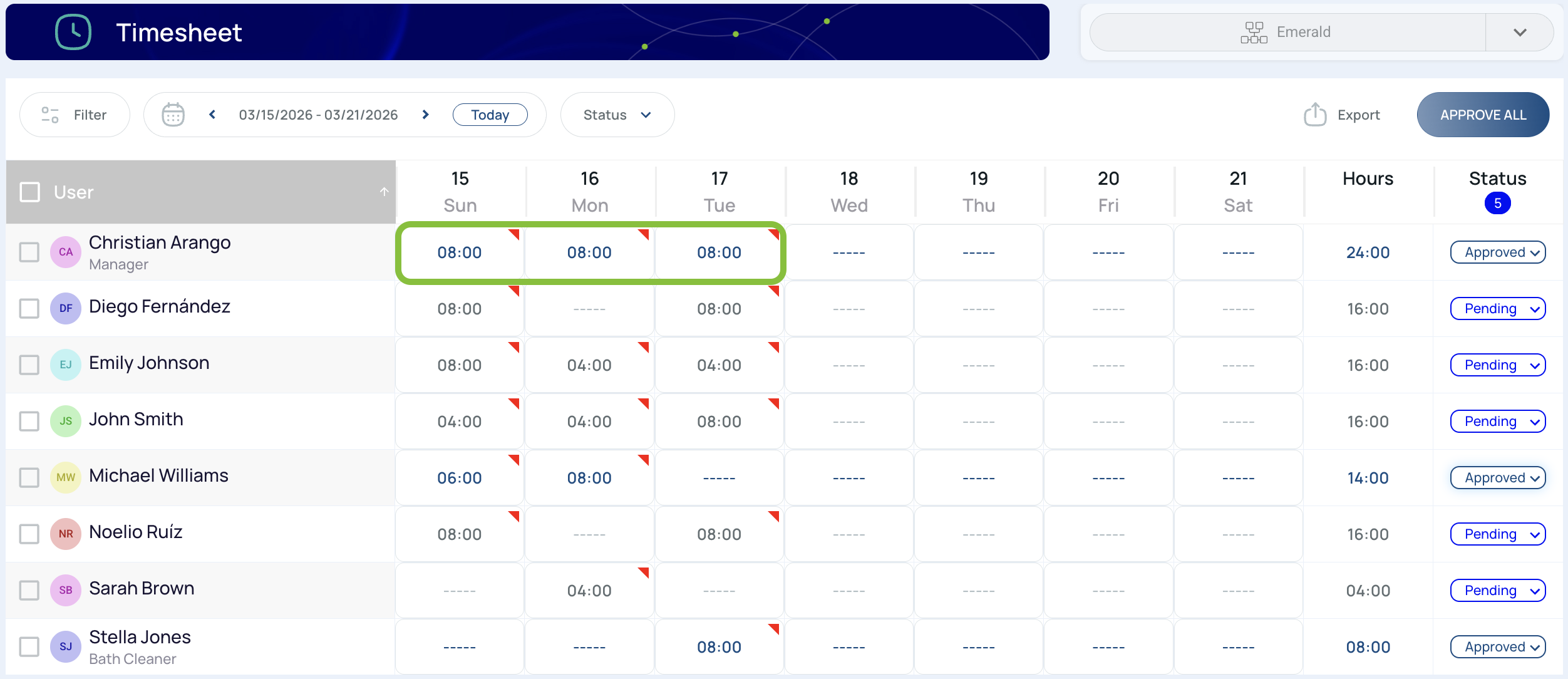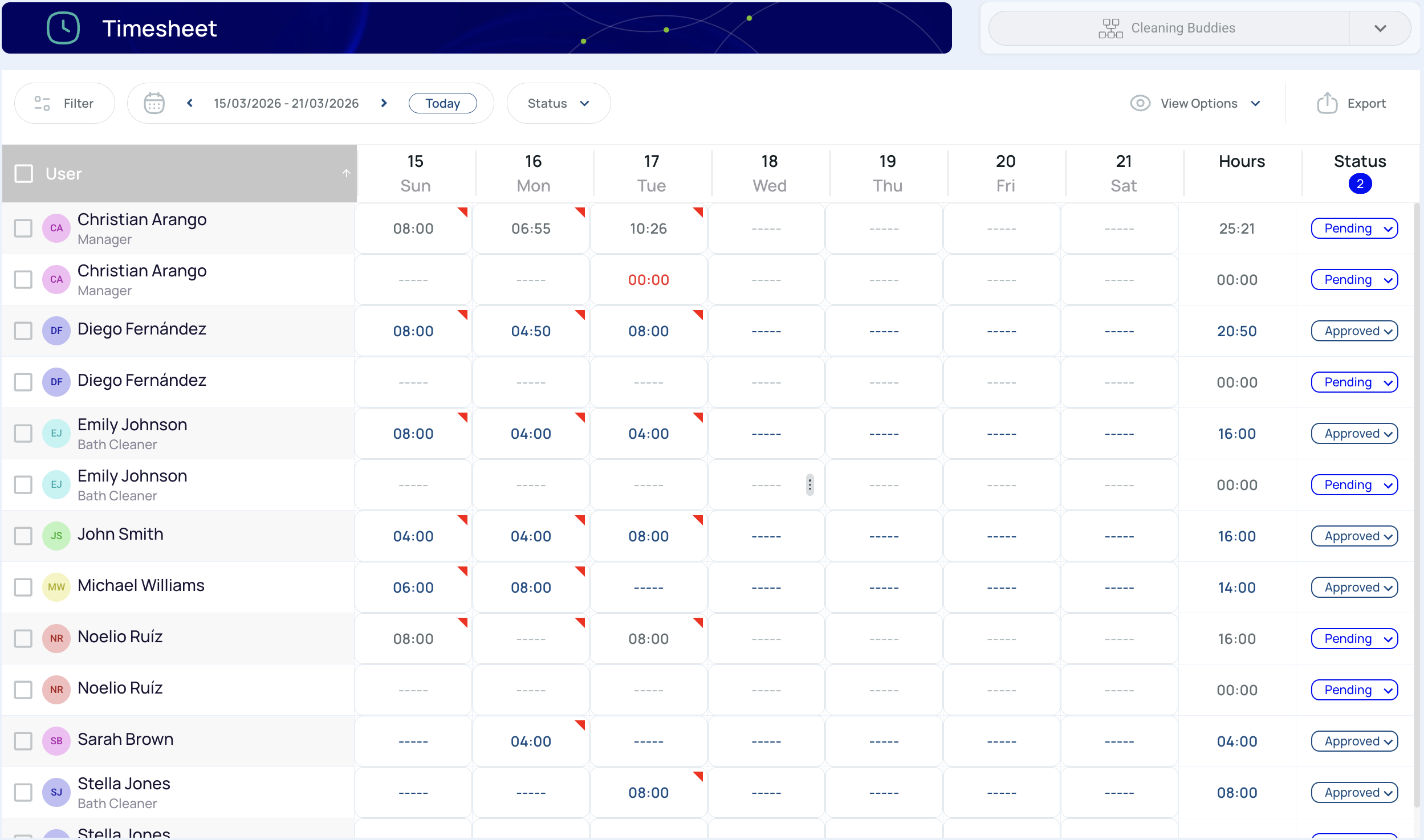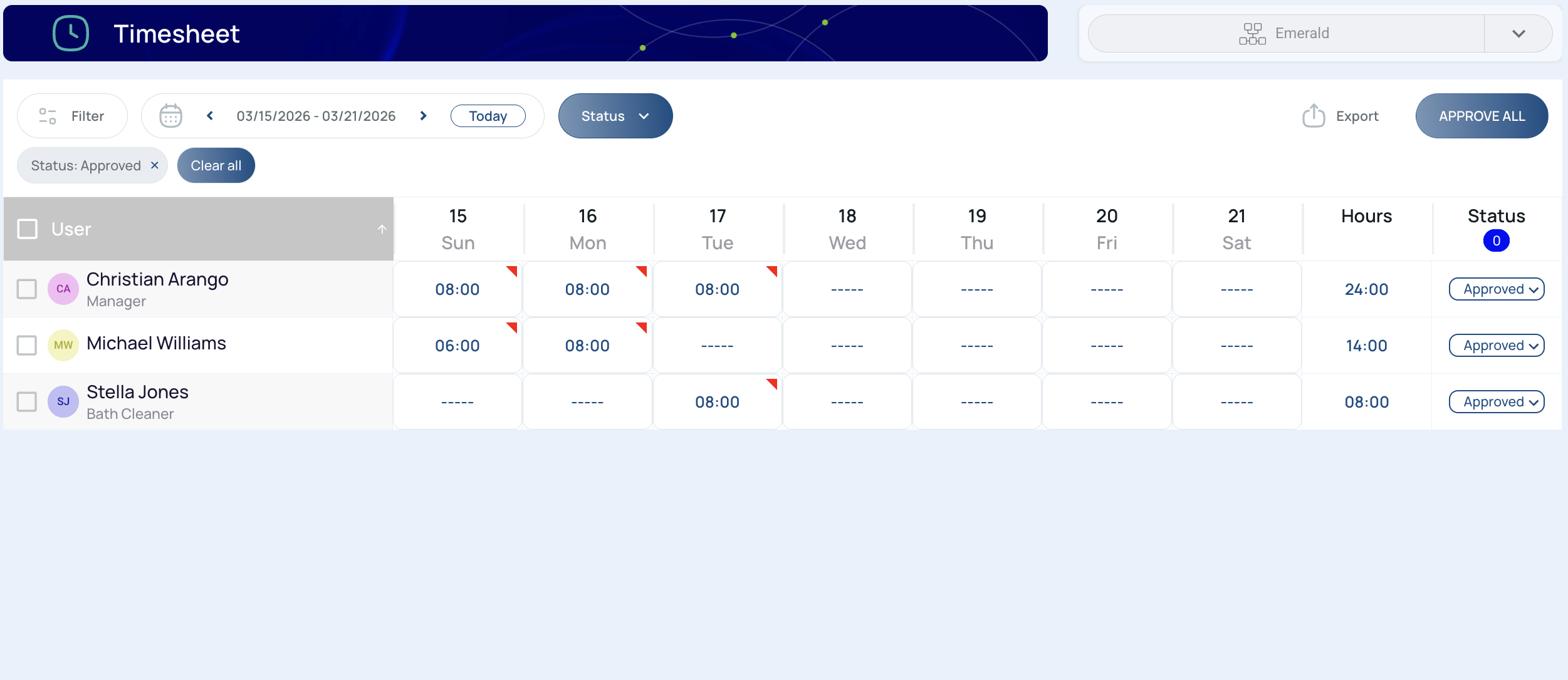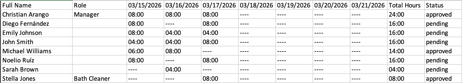 - Status: Displays the approval status of the user’s hours.