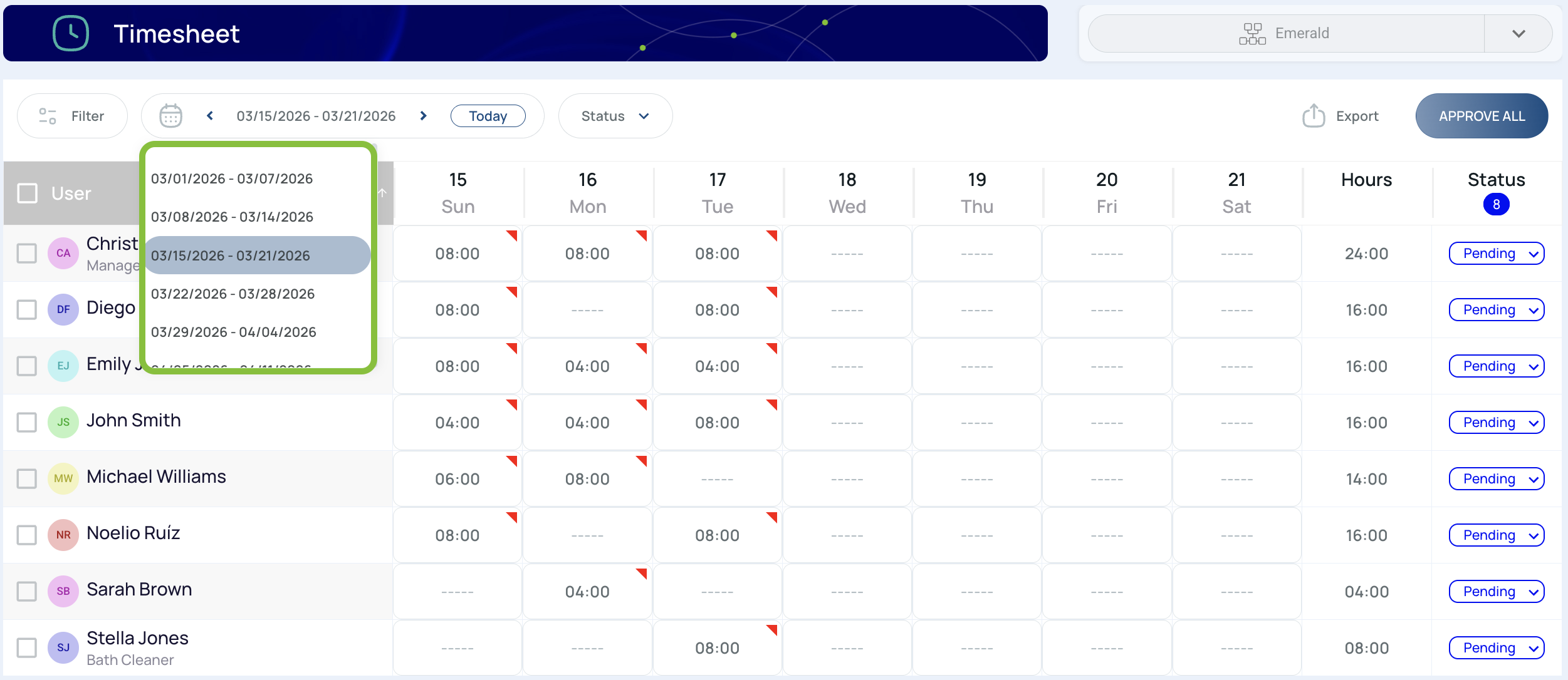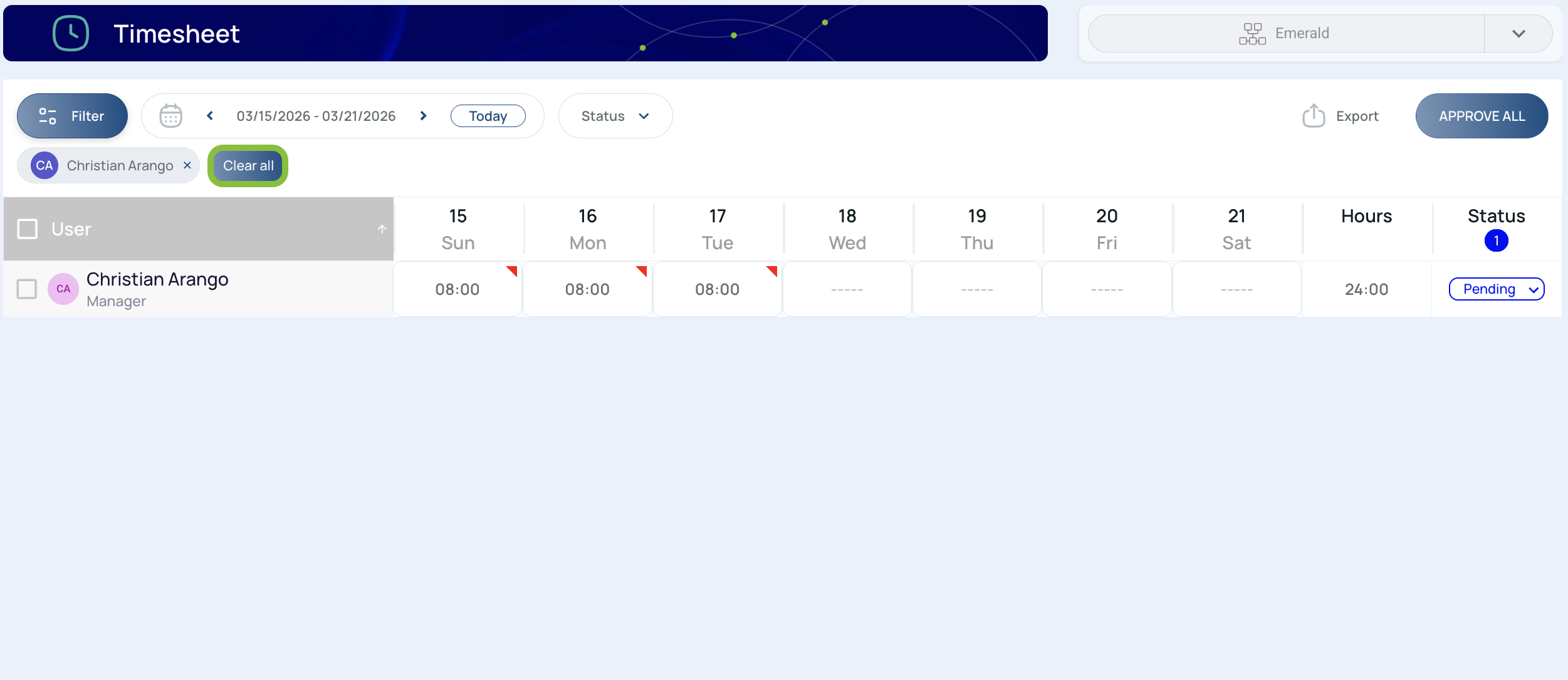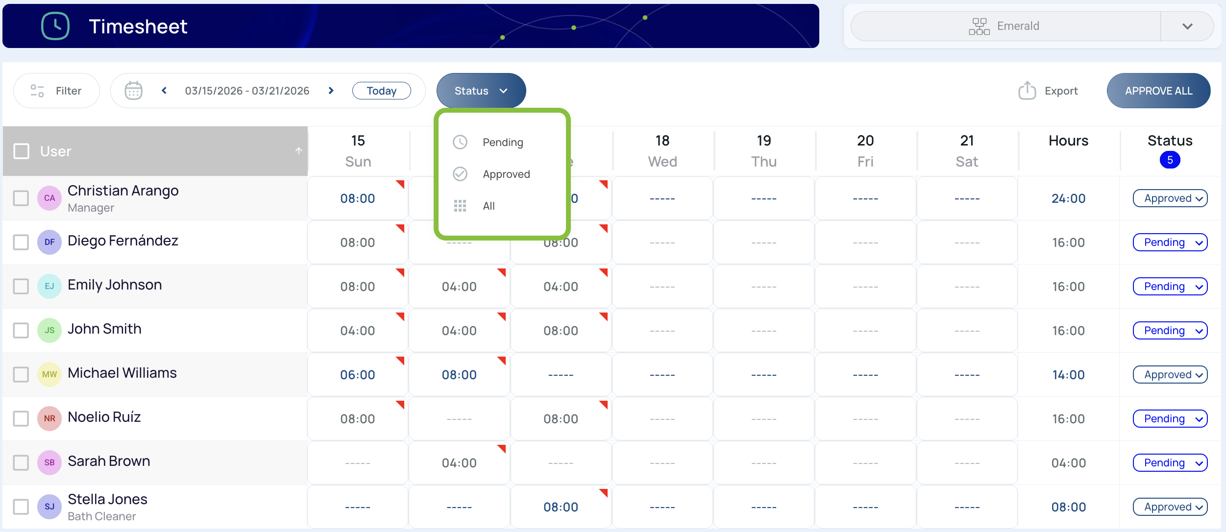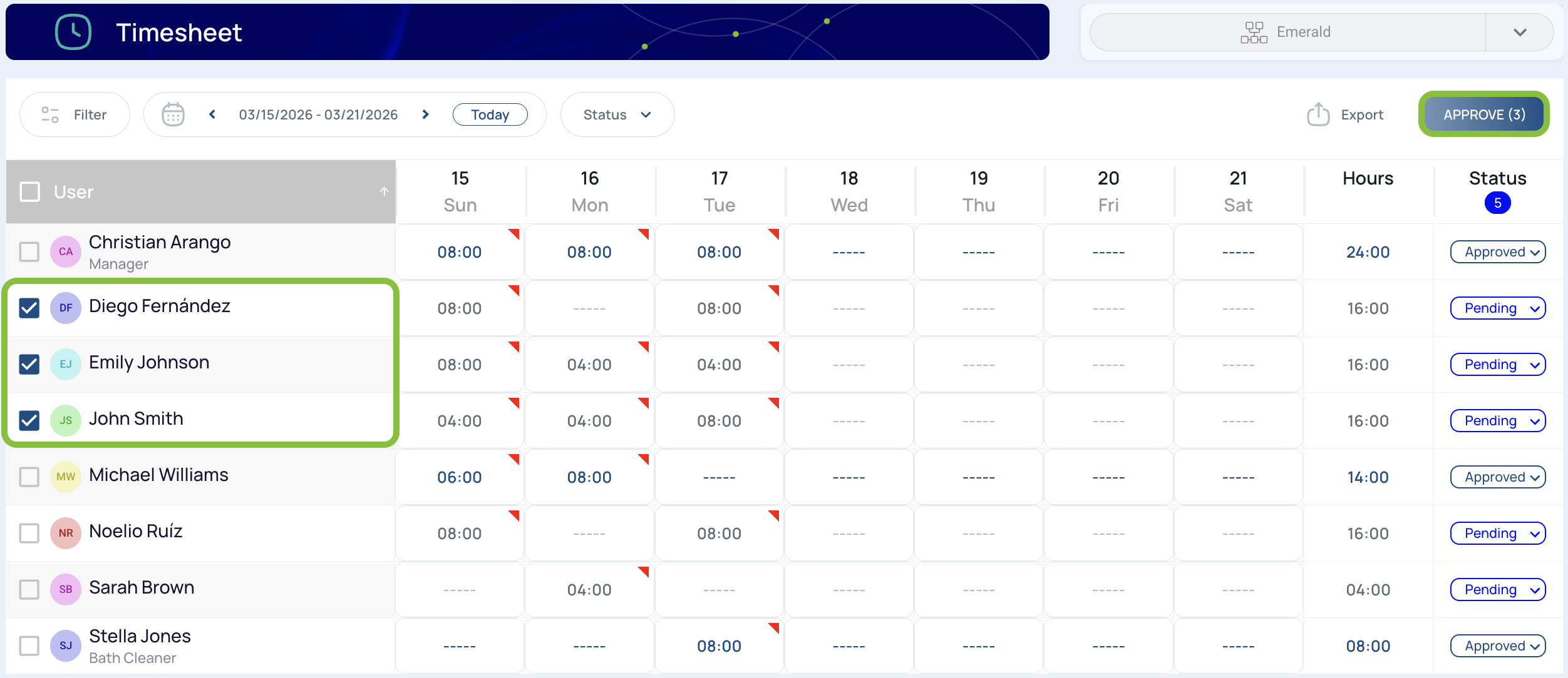 - Status: Displays the approval status of the user’s hours.