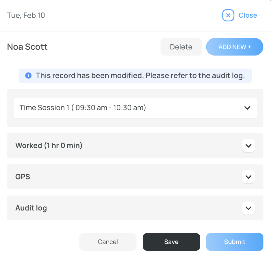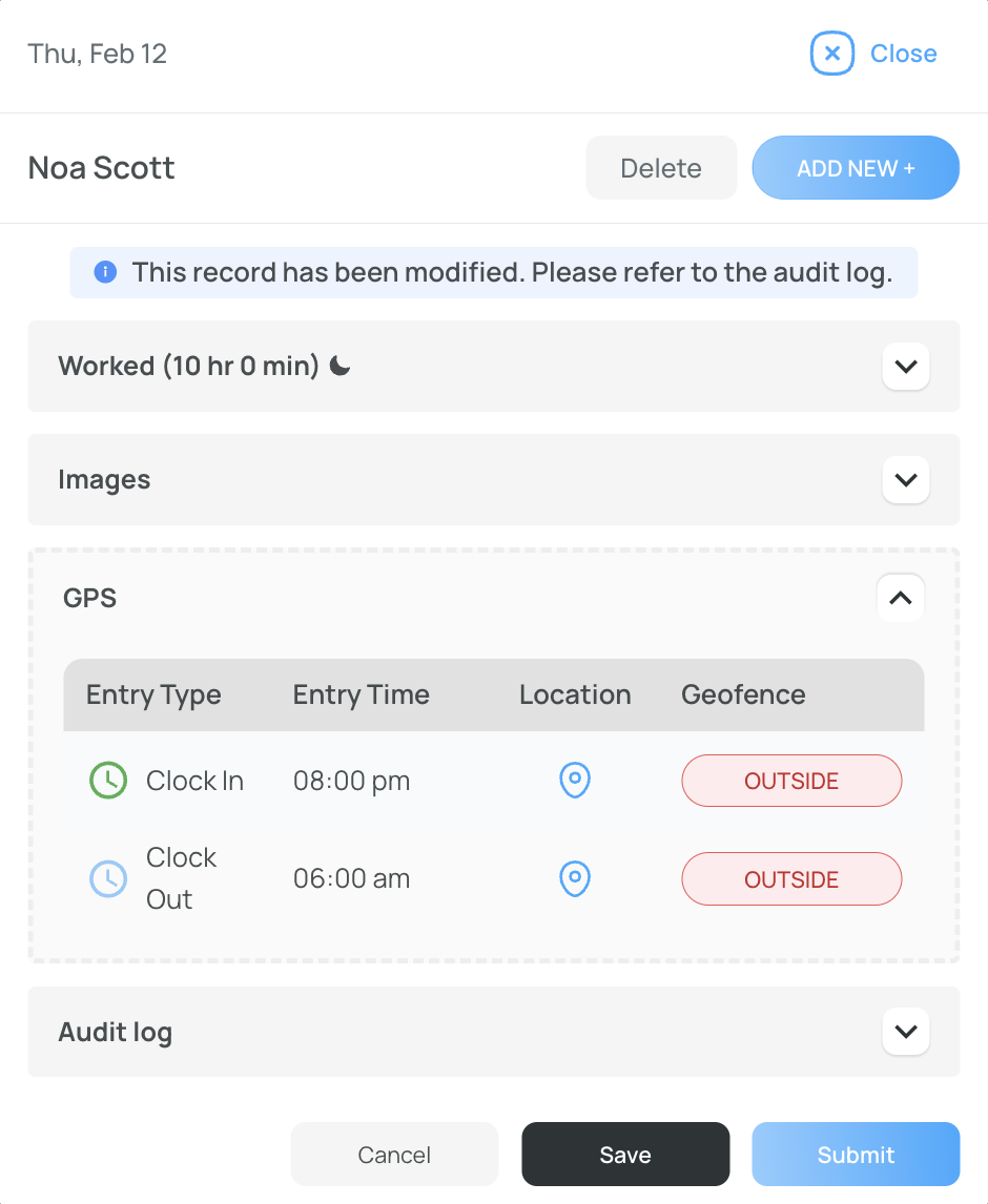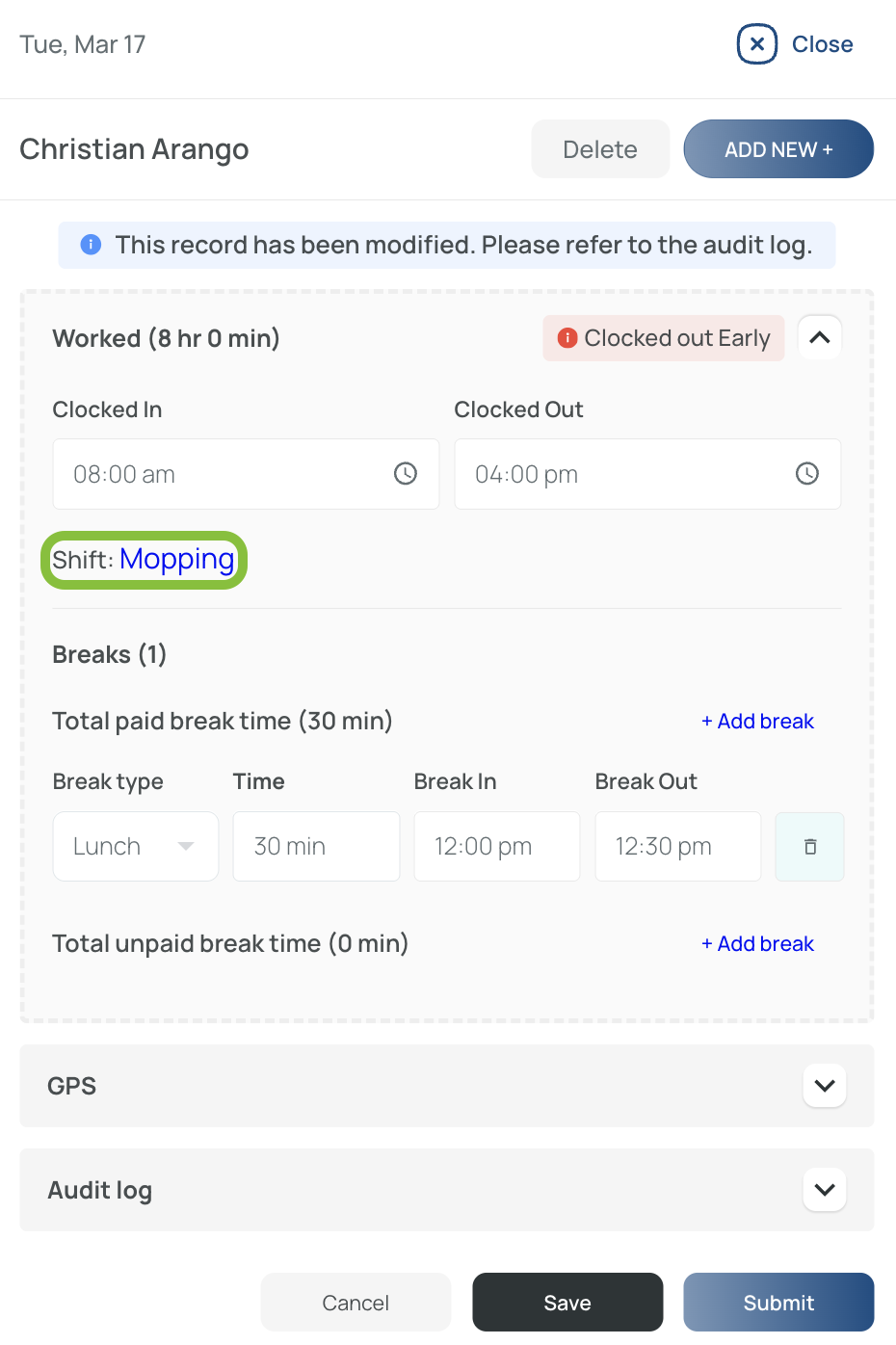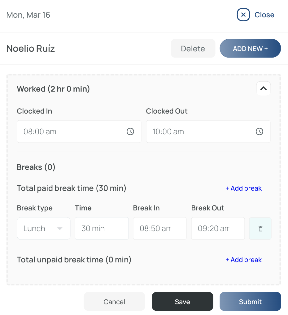You can also modify the clock-in and clock-out times and add or edit lunch and break times.