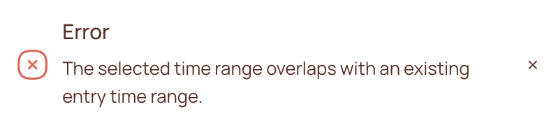 This error appears when a new time session or break overlaps with an existing time session or break. Review the entered values carefully before saving.