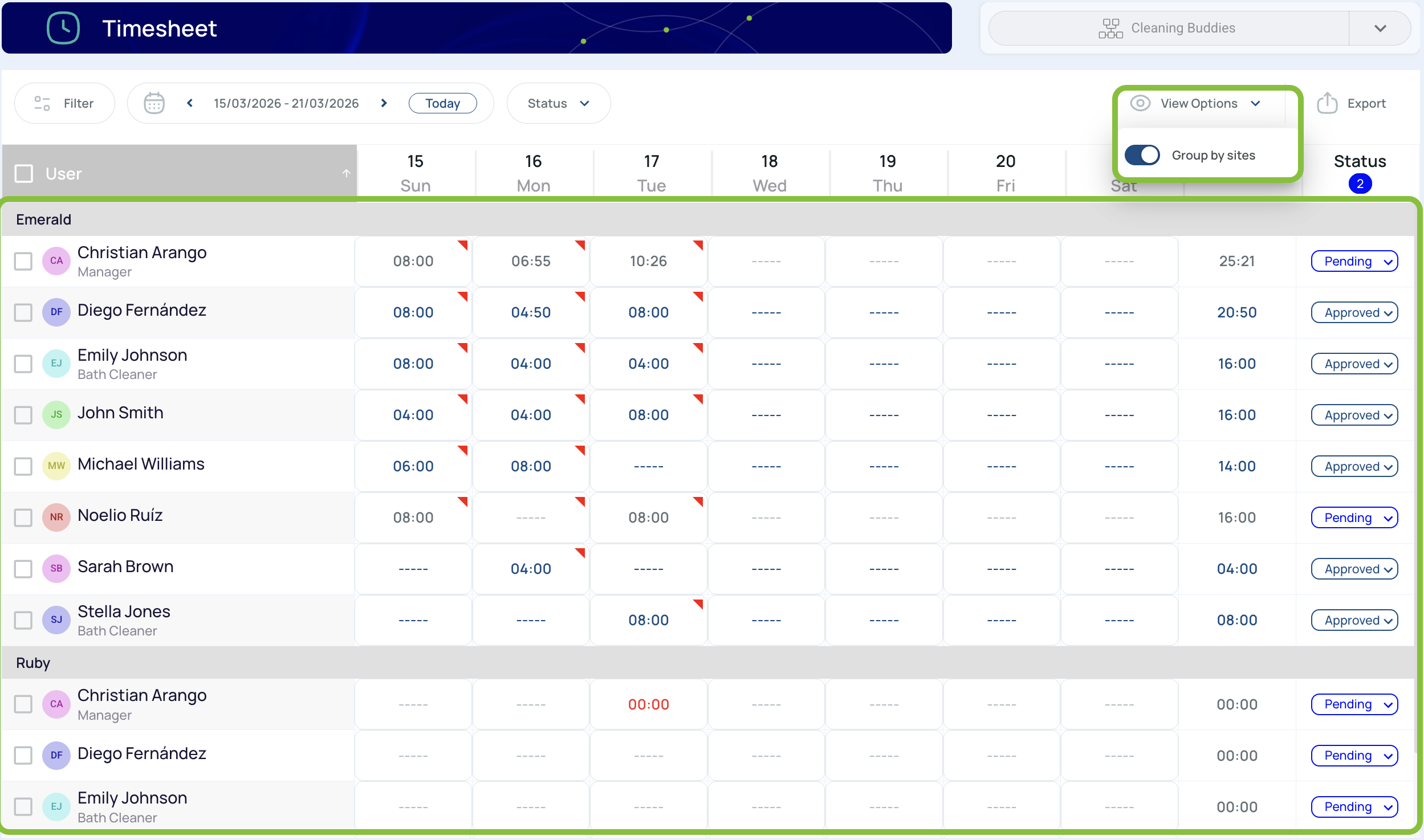 The timesheet will then show all active users from all available sites.