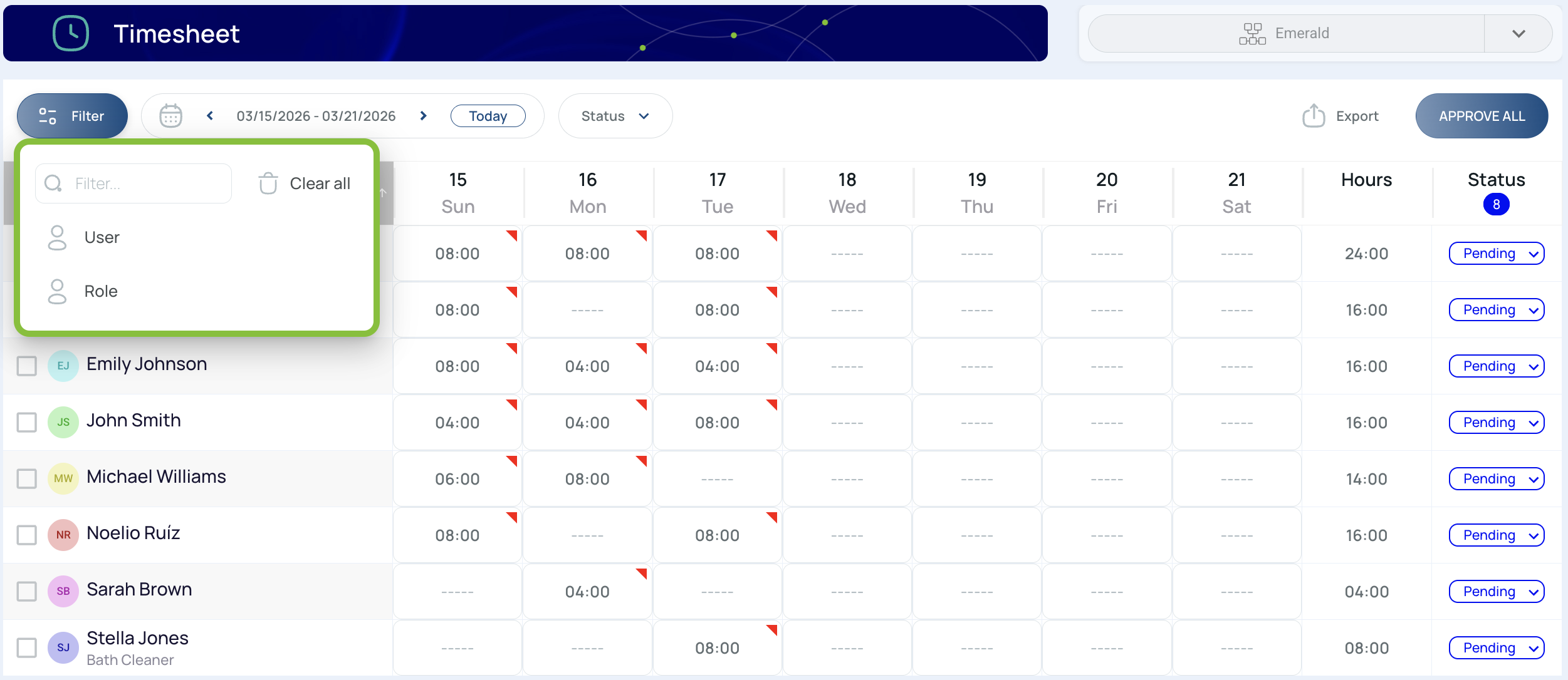 You can filter the timesheet by User and Role.