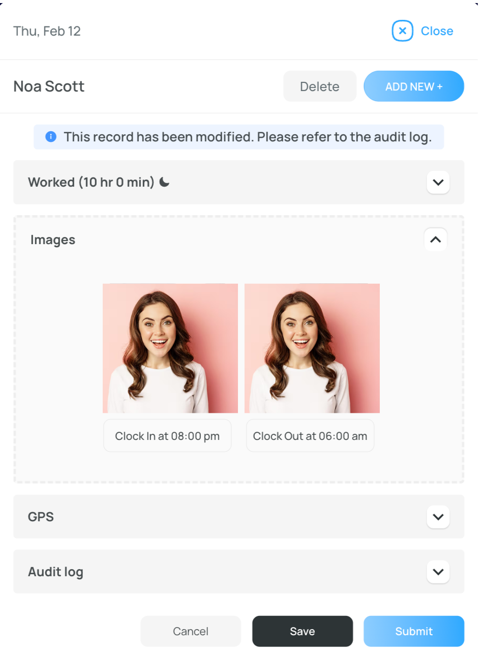 The Images section shows captured moments from the shift, such as clock-in, clock-out, break-in, and break-out, along with the time when each image was taken.