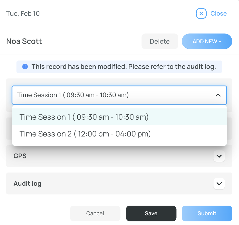 If you open the Time Sessions dropdown, you can see all time sessions linked to the shift.