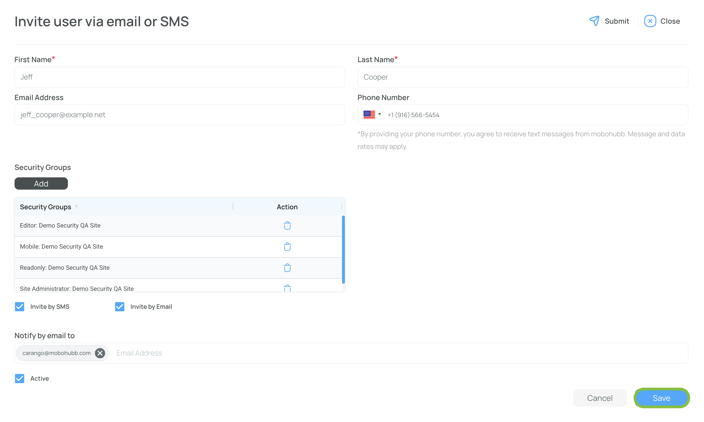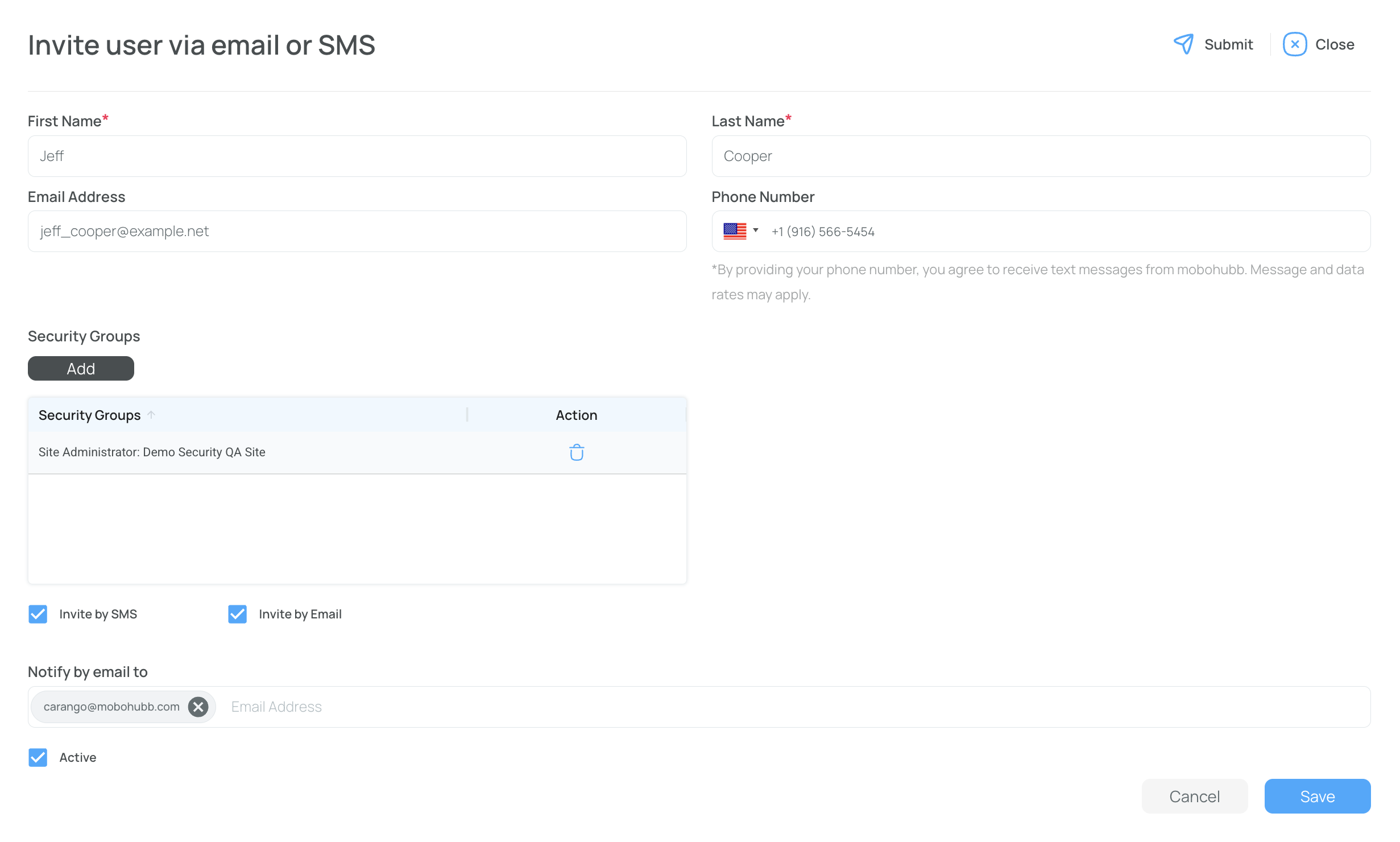 Learn how to add, edit, and activate/deactivate users in mobohubb. This guide explains how to manage users, assign security groups, and update personal information for both web and mobile access.