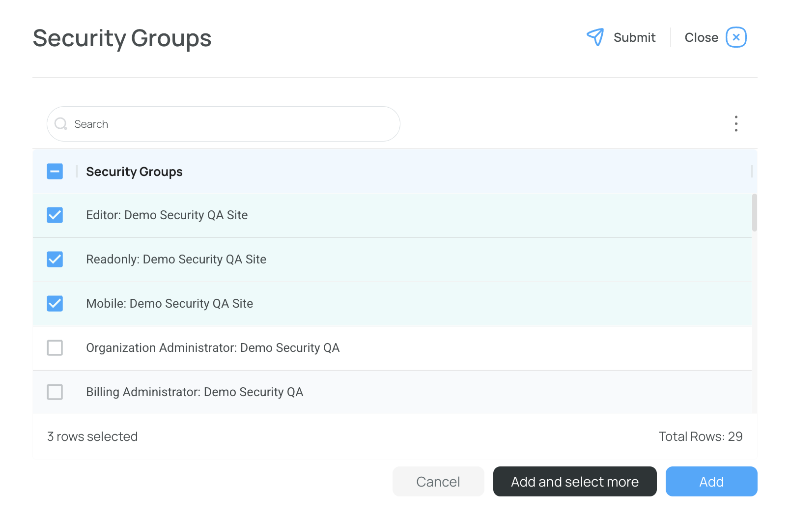 - Choose the Security Group from the dropdown menu. Press Add ans select more to continue adding more security groups. Press Add to save the selection and close the window.